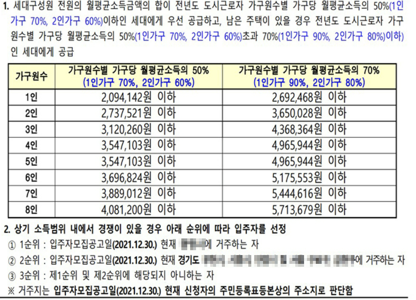 - 우선 공급 물량 대상자는 월 평균 소득 50%이며, 1인가구 70% 2인가구 60%입니다.