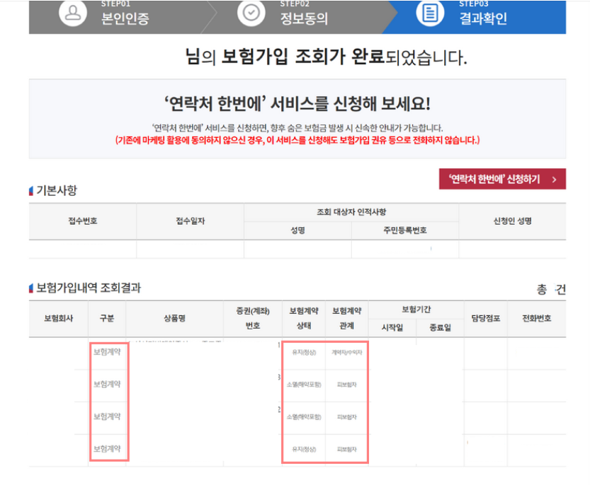 내역을 보시면 보험회사, 보험계약, 상품명, 증권번호, 계약 상태, 보험계약관계, 연락처 등 나옵니다.