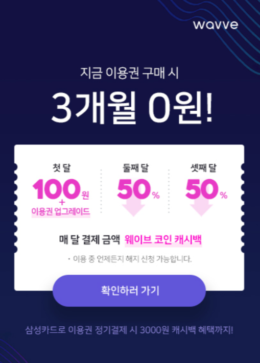 완전히 무료는 아니며, 첫 달 100원으로 이용이 가능하고 이용권 업그레이드와 웨이브 코시 캐시백 이벤으로 3개월까지 부담 없이 이용이 가능하며 언제든 해약이 가능하기에 추천드립니다.