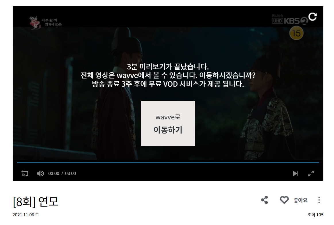 옆에 있는 "연모"도 한번 눌러보았습니다. 오늘 기준으로 2일전 방송된 드라마지만, 3주 후에 무료보기 가능하다고 나오네요.