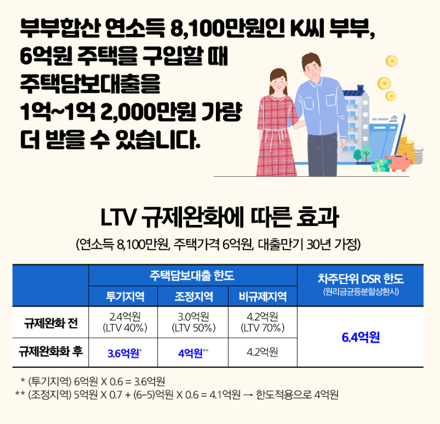 • L T V : 투기과열지구 6억원 이하 60%로 완화, 조정대상지역 5억원 이하 70%로 완화